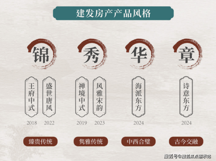 建发先后发布了多款不同风格的新中式产品,在全国70多个城市落地开花;为了重塑“好房子”体系,建发房产将原有的六款新中式产品凝练为「锦·秀·华·章」四大产品系列:
