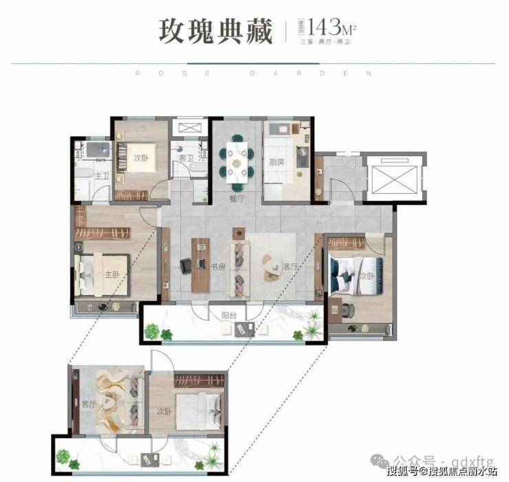 •舒朗三居:约12.6米南向三面宽,全明通透;