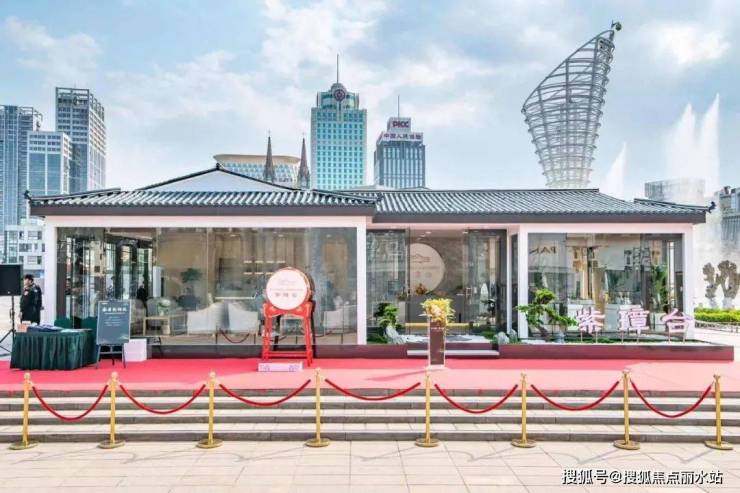 在建筑打造方面,紫璋台汲取千年中式建筑的审美精髓,以“灰、白、黑”为建筑主色调,承袭国风五法技艺匠心雕琢,将万字符、如意纹花窗元素点缀其间。