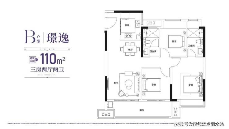 建面约110㎡三房两卫户型,全明格局,约6.5米宽阳台,很绝!还赠送3个飘窗面积!且有独立玄关区,主卧有独立衣帽间、卫生间,可以满足首次改善家庭的需求