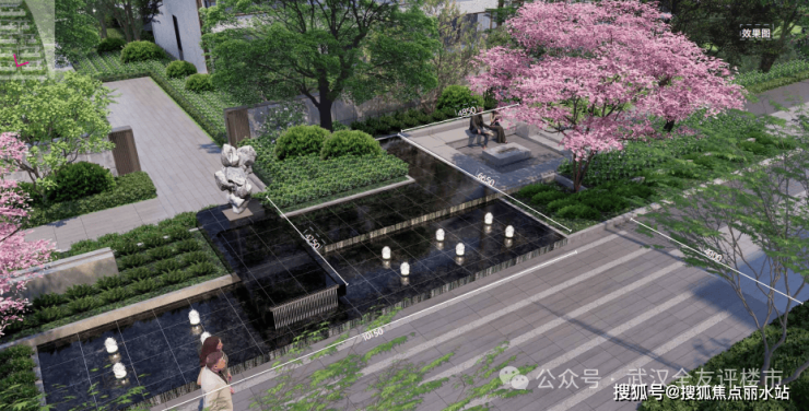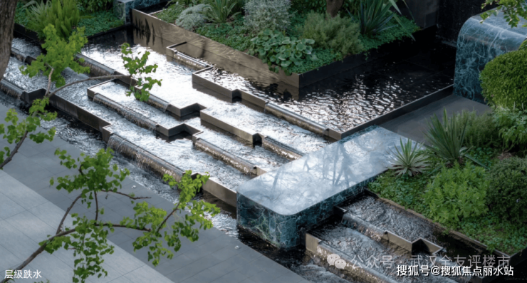 以层级跌水、抽象雕塑营造艺术氛围,结合精致矮墙形成围合式下沉卡座