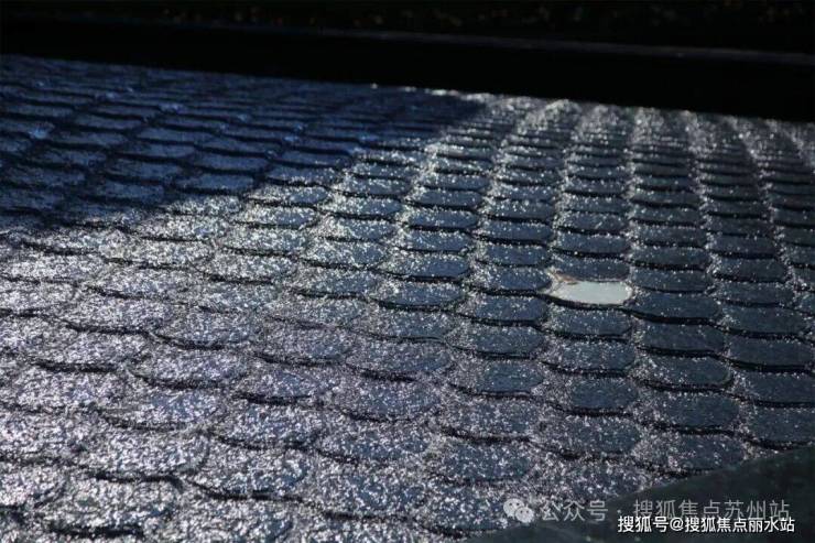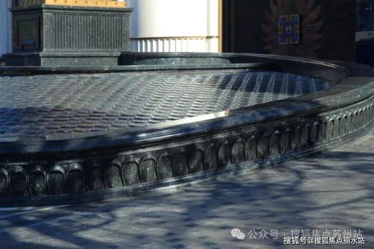 水景基座甄选巴西绿钻石材打造,与玉兰门庭的 14 种奢石形成呼应。石材的天然肌理与水波光影交织,搭配大门土耳其月光米黄石材、景墙玻利维亚蓝奢石的色彩层次,从浅米到深蓝再到暗绿的自然过渡,宛如海湾从晨光到暮色的温柔变幻,于静谧中透着深邃的奢华感。