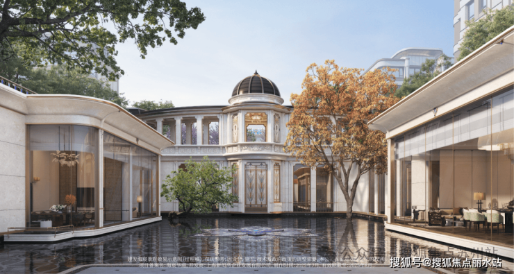 入口大水景以意大利特雷维喷泉为设计灵感,并非简单复刻,而是深度融入海派土地的东方文化基因——龙鳞纹在水景中隐约浮现,既暗藏东方美学的精致细节,又承载 “纳气聚财” 的吉祥寓意,实现西方经典水景形态与东方文化意象的无缝衔接。