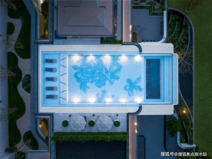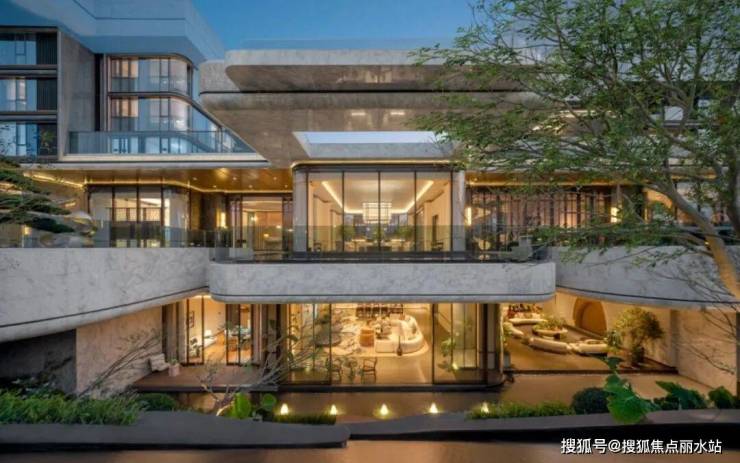 面对弥珍的地块,湖境月华以「伦敦瑰丽酒店」为景观营造母本,借一线水岸资源,通过立体嵌套、内外渗透、功能复合等造园手法,在有限的场地,构筑一幅自然与雅奢交融的立体画卷。