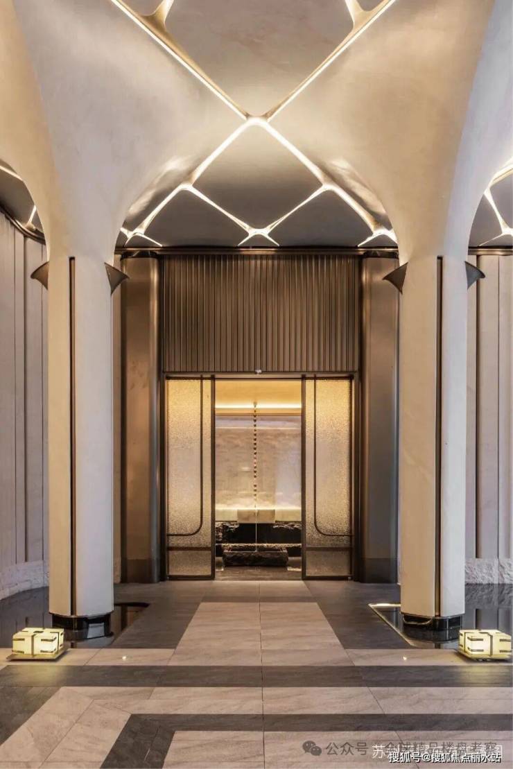 坡道采用柱廊阵列造型,阵列间穿插铺设透光云石,搭配智能化灯光控制原则,灯光车行随亮。门楣处以奢石点缀,营造出星级酒店般的豪华感。入门有“迎宾毯”光厅引导,车马厅以腕表解构布局搭配掐丝珐琅地面,每个细节都彰显奢华。