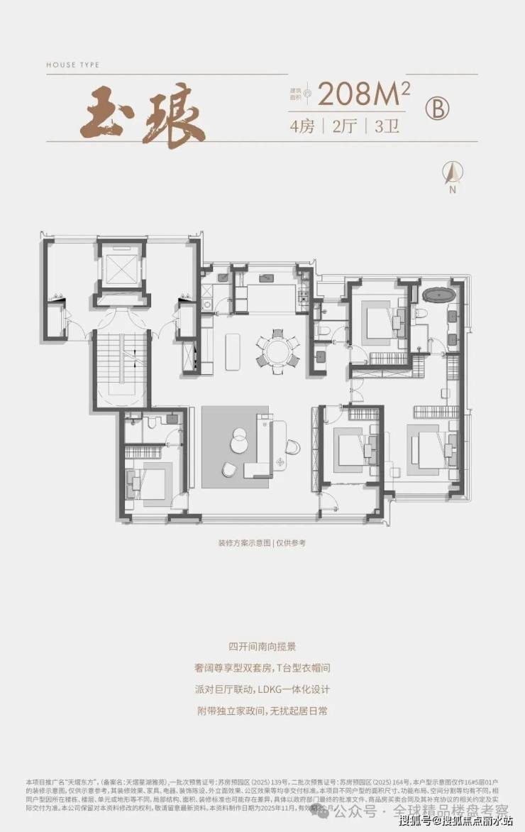 主力户型为建筑面积约208㎡四房,采用类一梯一户设计,强调居住私密性。该户型实现约16.9米南向面宽、近80㎡的LDKG一体化厅区,并设置独立家政间与全龄段套房,兼顾社交接待与家庭起居需求。