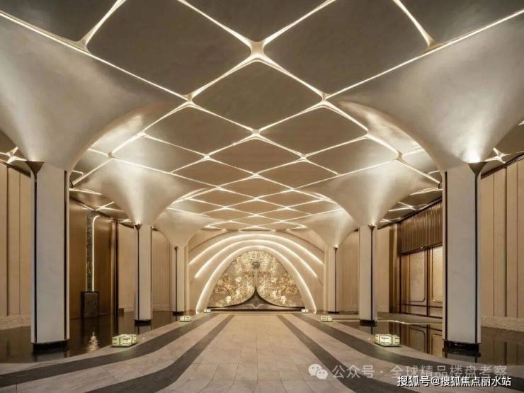 约44米玉阙迎辉主入口,结合潘多拉奢石与红果冬青,营造归家仪式感,"八方来仪"殿堂式立柱拔地而起,弧线向上尽显望族门风永续,站在门口就能感受到扑面而来的豪门气场。