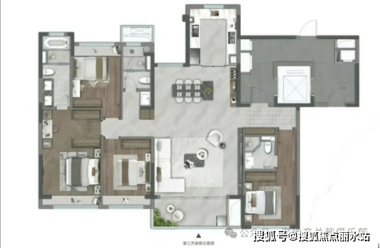 •251㎡高层户型采用270°环幕客餐厅设计,北向落地窗直面京杭大运河,三开间朝南,增设独立储物间,北向厨房通过玻璃幕墙衔接设备平台