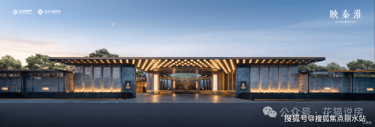 它的设计灵感源自南京六朝古都的礼制文化“一进登门望府,二进穿庭入画”,约百米宽、7米高的超常规尺度主入口, 扩大了整个楼盘的封面, 它的用材尽显奢侈——