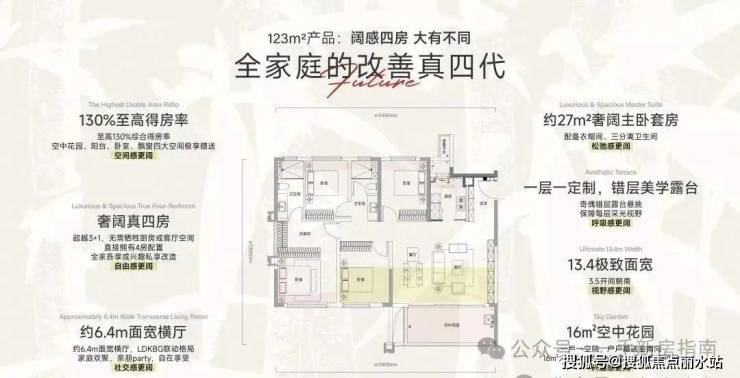 南向面宽约13.4米,其中客厅面宽约6.4米,空中花园有近16个方!