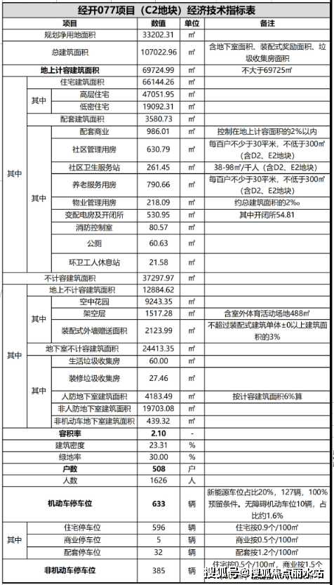 项目容积率为2.1,建筑密度23.31%,总户数为508户,机动车停车位633辆,其中住宅停车位596辆,商业停车位5辆,非机动车停车位385辆。