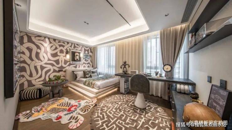 儿童房采用潮酷赛车主题,打造放飞童心的悠闲娱乐集合地。通过动感科技的植入,包括灯光式渐变壁饰和日历摆件,色彩感手工编织的地毯点缀,手工赛车跑道模型,让空间更显活力。