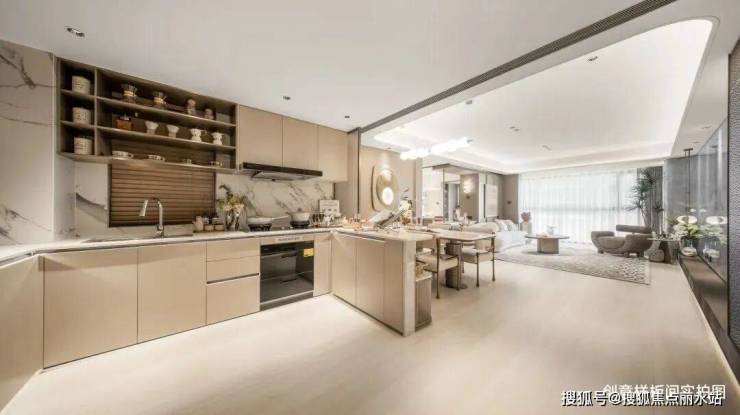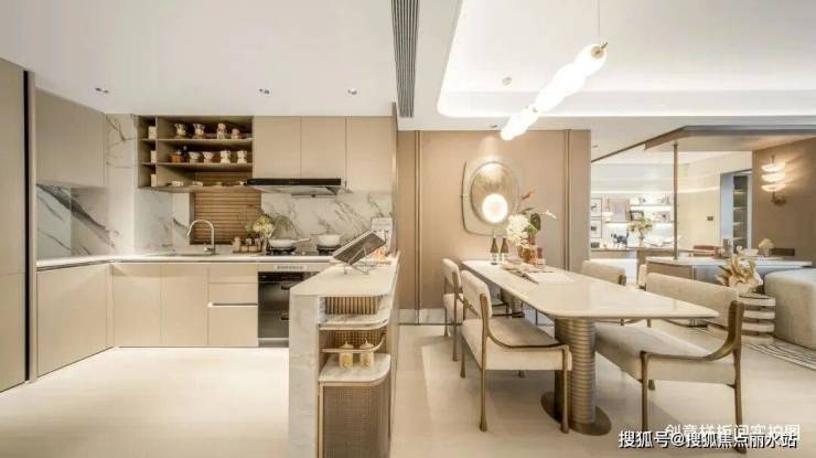 开放式“U”型厨房,与餐厅相连,营造烹饪与聚会间的亲密距离,家庭成员间的互动变得更加从容;同时设计上打造大面积餐边柜,生活功能与美学兼具。