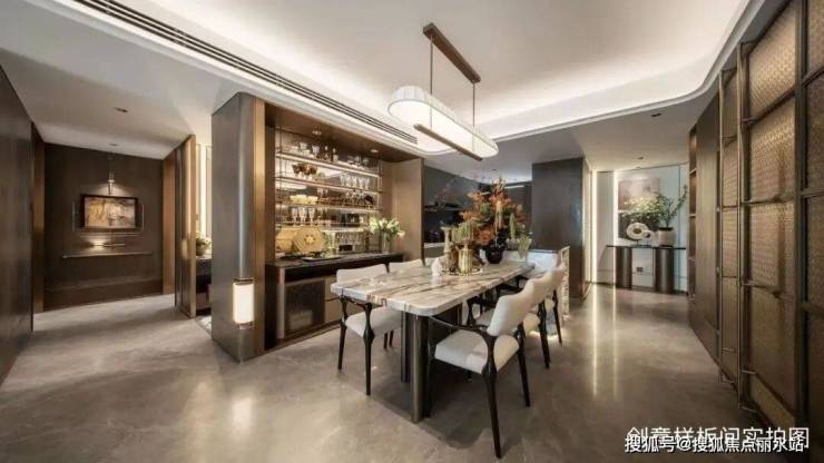 LDKB一体化布局,将空间的次序感与张弛有度的节奏推演至极。设计上以发光云石作为空间亮点,柔和不失体感,餐椅为古铜打造,质感与造型并存,陈列艺术品与“花”主题契合,提升生活感的清新和雅致。