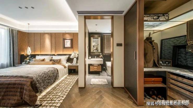 红棕色基调主卧套房,以海派复古风格静诉着主人的美学品位。开放式衣帽间延续了空间的流动,让功能与美学相得益彰。