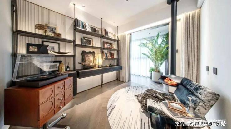 层架陈列来自各地中古藏品及书籍收纳,安放生活志趣;整张马毛材质制作的休闲沙发散发独特的自然美感,加上壁炉的悠闲气质,彰显隐贵格调。