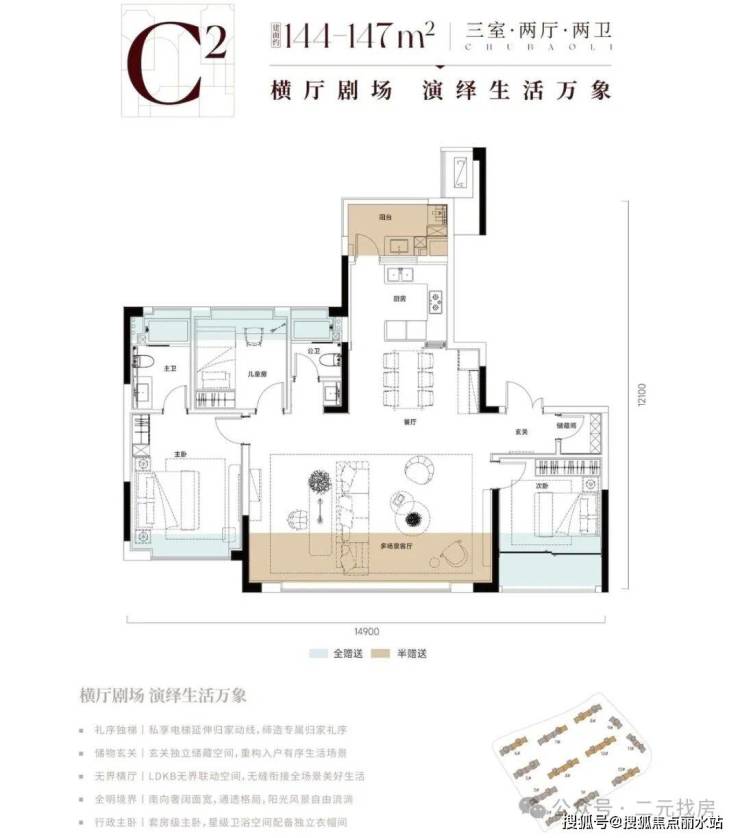 144㎡户型,南向开间14.9米,大横厅设计,南向次卧的赠送面积较多,主卫和次卫也都有赠送面积。