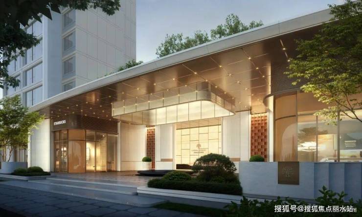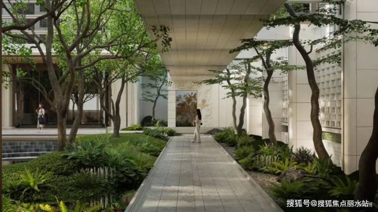 步入「阔景门庭」。南大门以约32米宽奢挑檐、约6.6米层台高门,中央设计圆形涌泉叠水,黑金沙水景池底,两侧特选朴树与红枫,米白色石材与学院色陶砖沉淀出知识的气息。