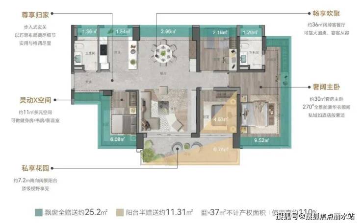 海德理想城120㎡A户型:飘窗赠送面积约25.2㎡、阳台赠送面积约11.31㎡,整体方正实用,得房率约110%。
