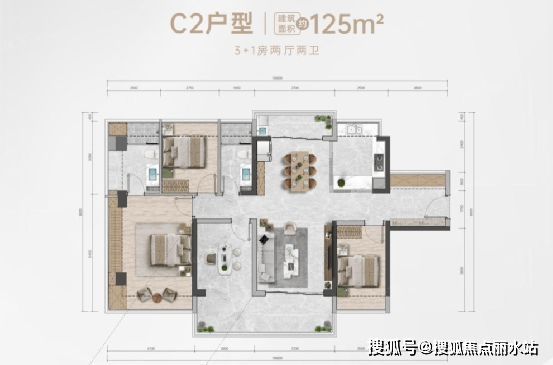 国贸府125㎡C2户型:大入户花园、6.5m超大阳台、4.1m大开间套房、8.3㎡大主卫,得房率约105%