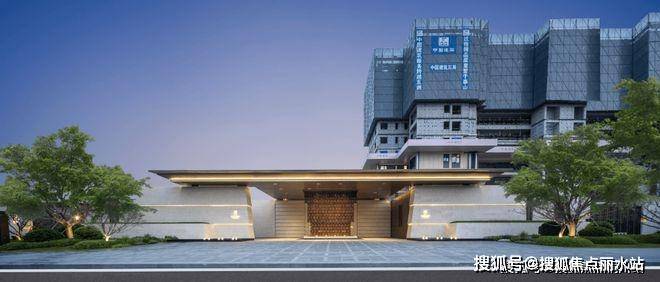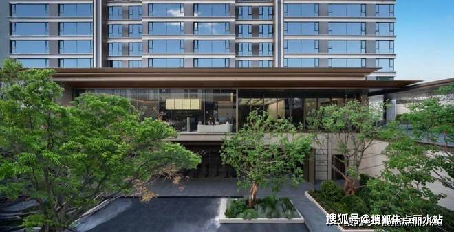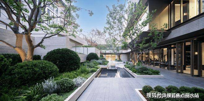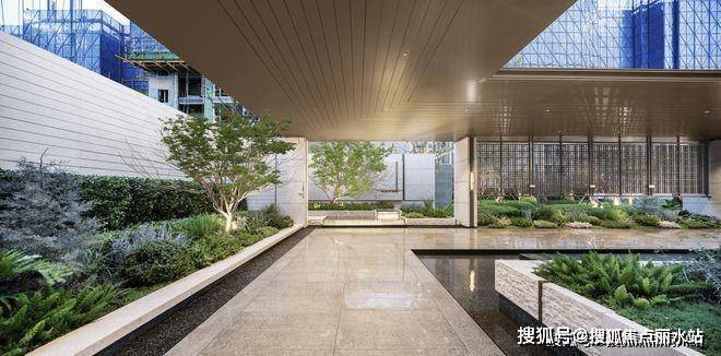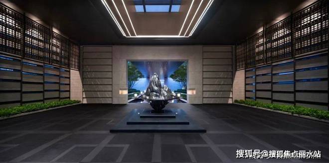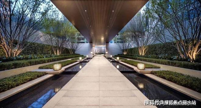 经环岛登台阶入挑高门厅,内陈艺术山石,顶部仿凿井天光,两侧香槟金金属垂帘雅致。再入静水步道,香槟金连廊配6棵榉树与灯具,寓意顺遂。