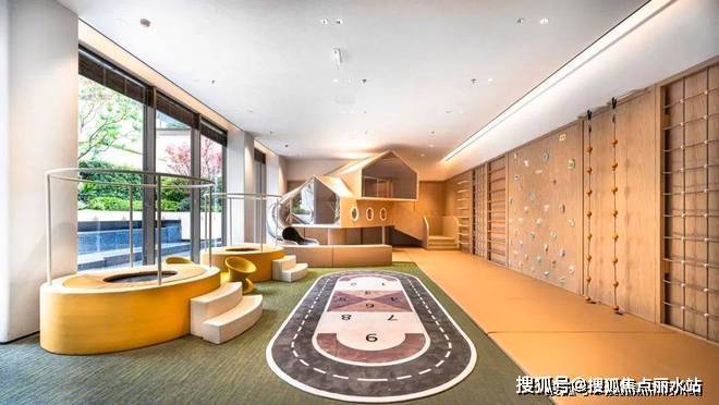 会所架空层:地下会所空间以成人健身与儿童运动为主。成人健身区功能分区科学丰富,含有氧健身、力量锻炼、瑜伽室等,儿童区设跑道、攀岩、蹦床等娱乐区及家长看护区。会所面向山水濮院,采用大面积落地玻璃,让业主健身或陪伴孩子时能欣赏四季景观,愉悦心情。