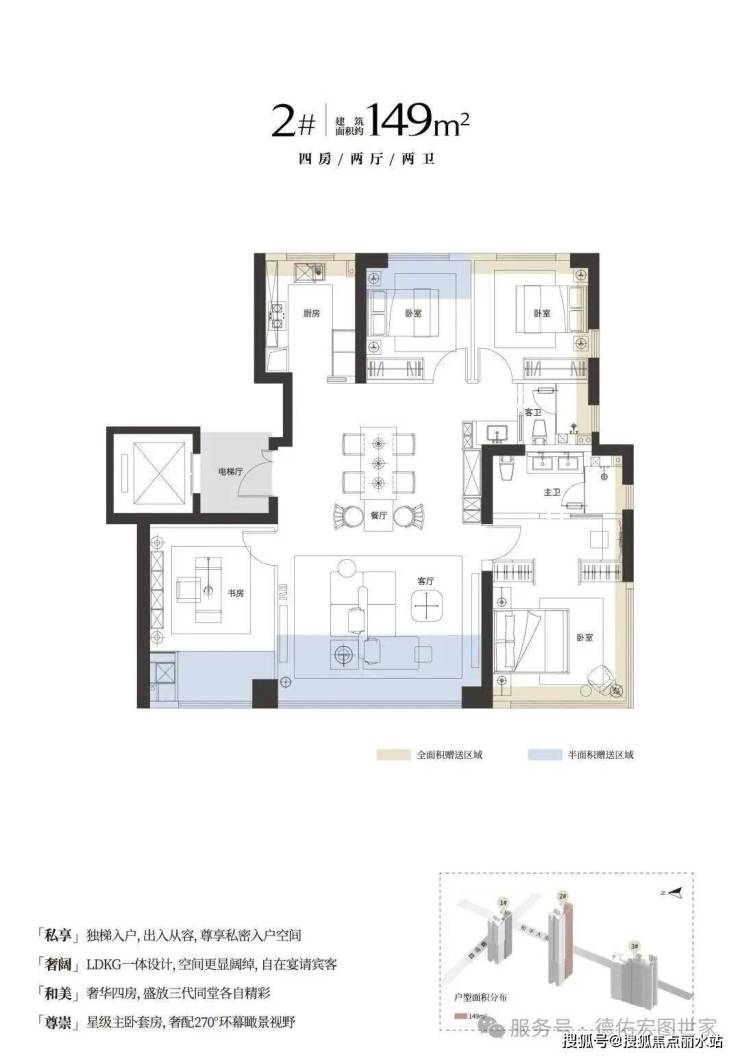该户型位于2号楼东头,紧邻和平大道,噪音影响不小,基本也不主打看江。除了入户与1号楼建面约149平略有差异,其它结构基本一致,不多做赘述。