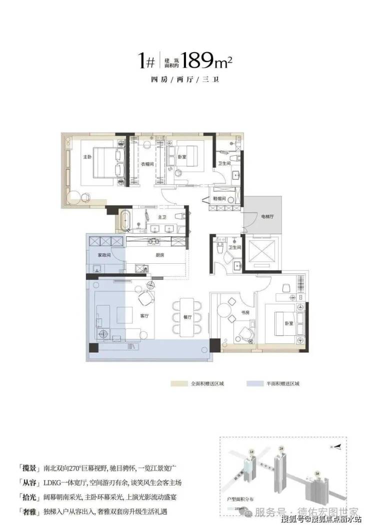 该户型为1号楼16-28层西边户,在153户型基础上增加了西侧家政间和北侧卫生间等面积,高区和低区做成了不一样户型。主卧做到了三面全景落地窗,客厅也有西南向270度的景观视野。该户型是本项目的王炸户型,即可以保证采光,也有不错的江景,但有西晒影响。