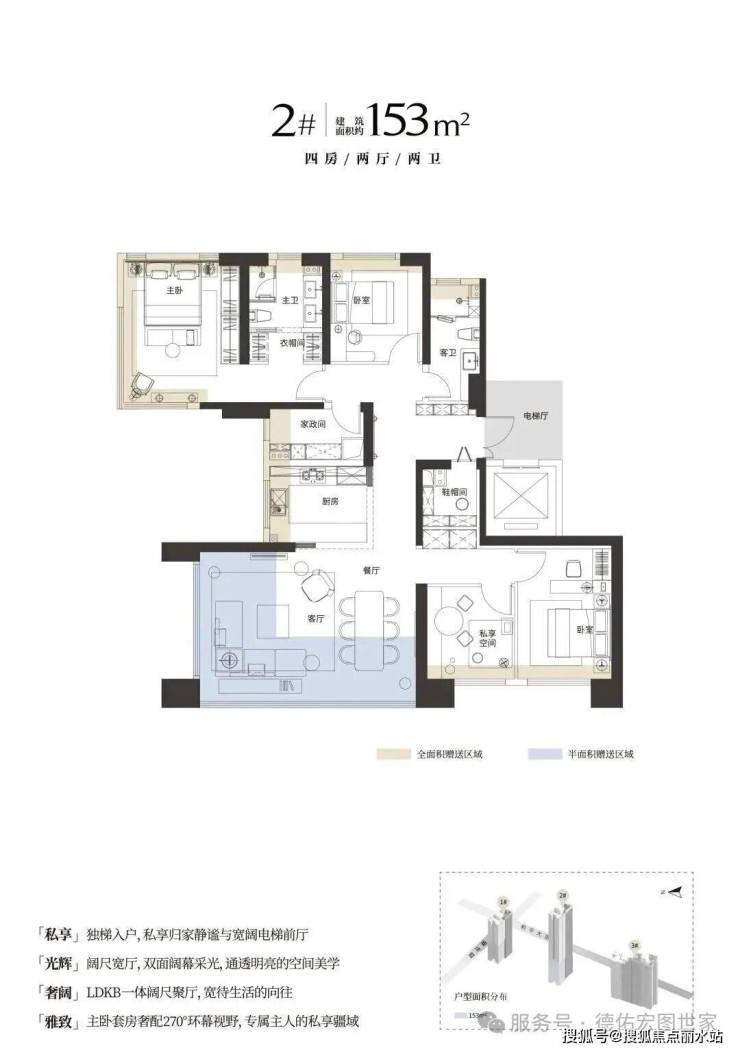 作为武昌滨江板块的又一个准四代住宅,同时高楼层可以看江,项目户型设计也非常有亮点。一方面,1、2号楼户型优化后得房率约95-96%(不算电梯前室),优化空间相对比较多;另一方面,同一条腿的户型做了看江、观景的差异化户型,3-15层为建面约153平小面积四房,16层以上为建面约189平观江大四房!可能不仅单价有差别,总价差距会进一步拉大!