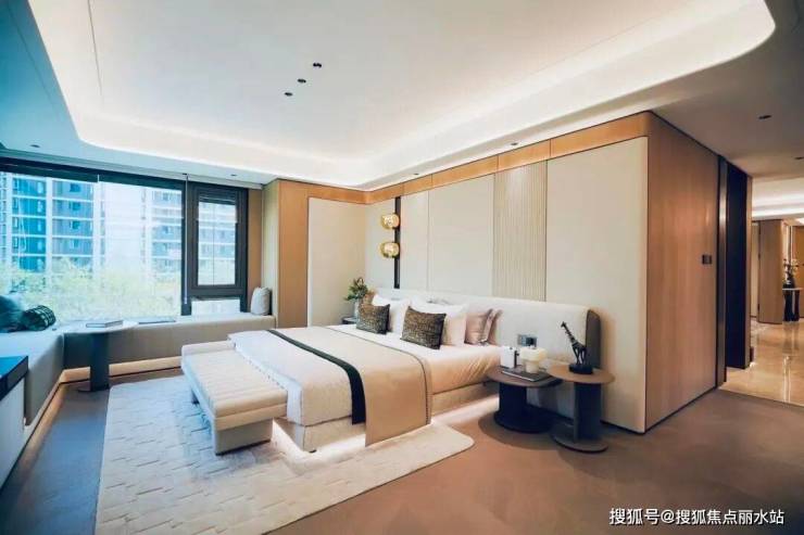 约10米阳台中,还创新设计了云上花池,把生态引入空中,在这里窗内草木生趣,窗外园林如织。约40㎡的主卧套房,270°L型转角飘窗,随时可以欣赏园林大师匠造的花园美景。
