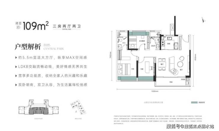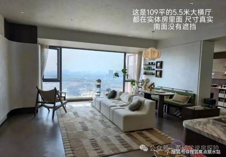 比如建面约109平 三房两厅两卫,属于连廊中间套,优化面积除了阳台之外也就三个飘窗,北侧私密性一般,不过它客厅开间做到了5.5米,空间感比较出色。