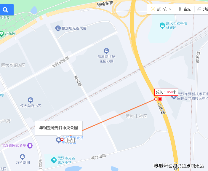 南侧为荷叶山路、规划文体医疗用地、融创光谷壹号院地块等;