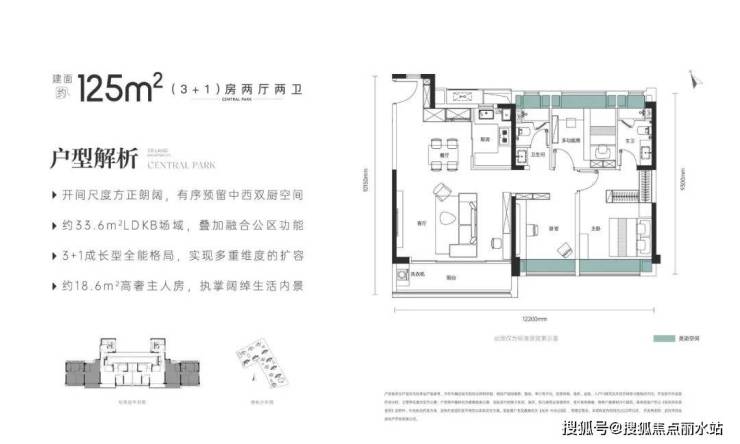建面约125平3+1房两厅两卫:三开间朝南的南北通透边套,方方正正,结构布局较好,也是改善客户比较喜欢的户型。