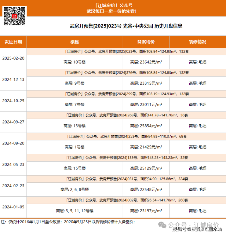 光谷中央公园:全盘进入收官阶段,所有楼栋均已推出,主推建面约108-125平毛坯房,好楼层折后约19000元/平,顶楼和一楼楼层清盘特价16xxx起,预计今年11月交付。根据房管局网签备案数据统计,该项目全盘1116套房源,目前已售1048套,算上顶底楼层仅剩68套未备案。排名2024年东湖高新区新房销量榜首。