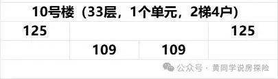 10号楼和6号楼楼栋结构以及户型分布基本相似,均是32、33层的高层住宅,一个单元,两梯四户结构,分布户型为建面约109-125平三房。