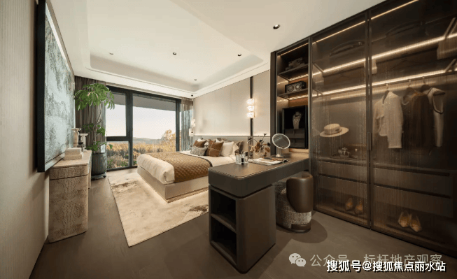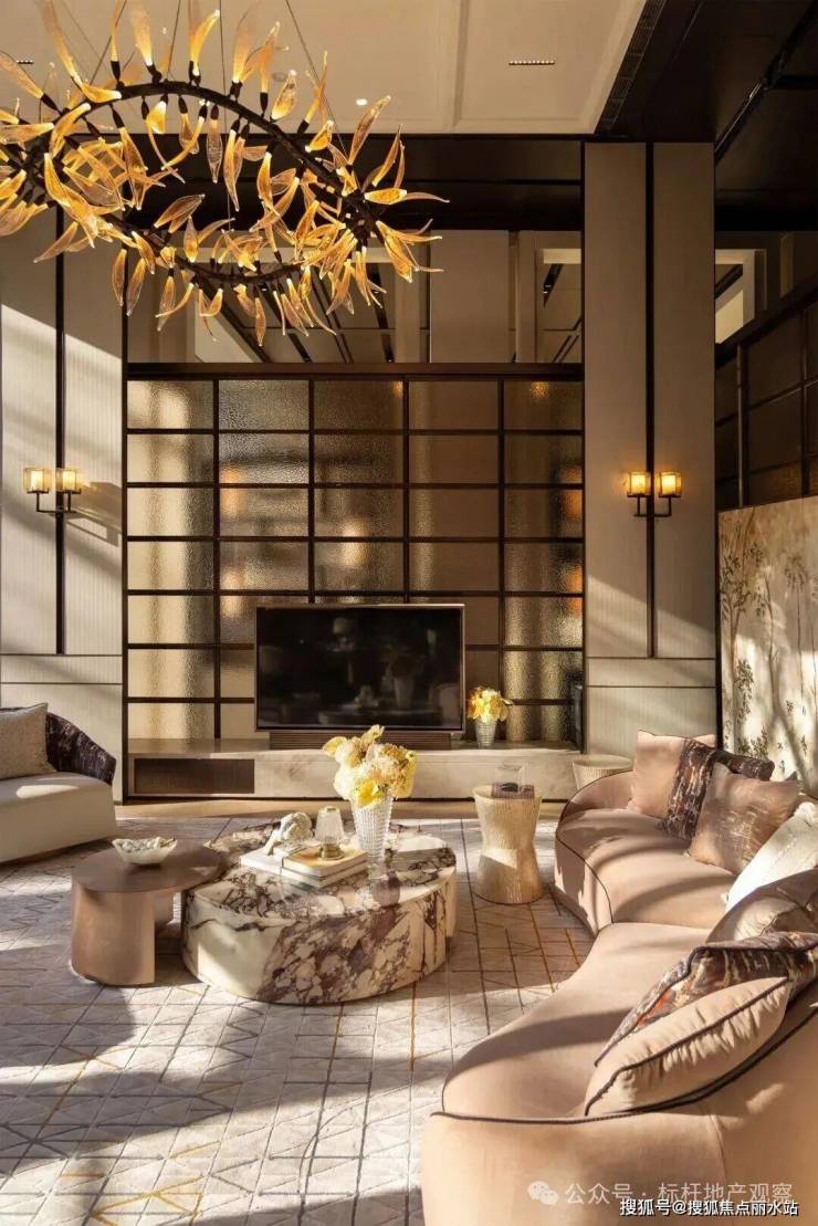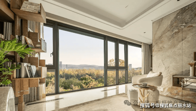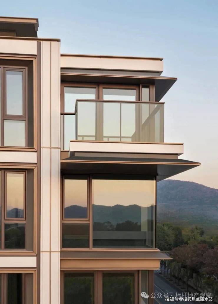 洋房南立面选用浅香槟铝板,搭配极细金色窗框与大面玻璃,整体精致轻盈,与紫金山及园林景致和谐相融,棕色金属线条,色泽沉稳如古城余韵,挺拔的形态传递现代礼序,呼应金陵风骨;LOW-E玻璃澄澈通透,又似秋水映光,虚实之间诗意流转;仿贝金米黄铝板温润厚重,再现六朝石刻般的典雅肌理。