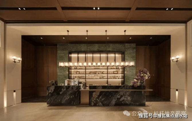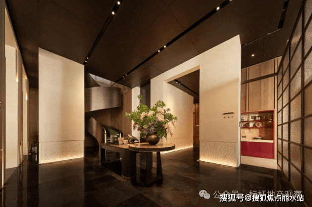 步入归家大堂,格栅式石材墙体犹如一面归家屏风,界定空间仪式序列。以传统“漏景与借景”方式,引天光入境,于若隐若现中,空间层次悄然铺展。