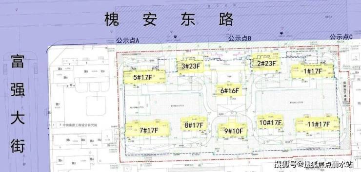 首先,地块面积为30094㎡(约45.14亩),整体容积率2.4,规划了10栋10-23F住宅,其中7栋16-17F小高层,1栋10F类洋房,还有2栋23F高层,可见高层产品占比并不高。