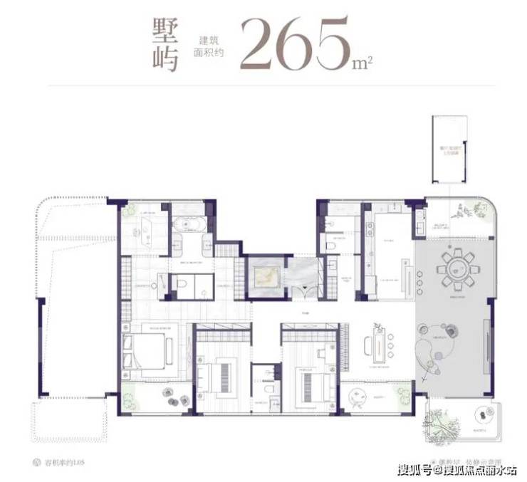 从目前开发商公布的效果图来看,整个小区仅有两种户型,建筑面积约199、265㎡,仅有101套。其中仅有5号楼是253㎡,为墅厅设计,层高约6.4米,位于小区景观中轴,前排无遮挡,其他都是198㎡,配置露台,准现房销售。