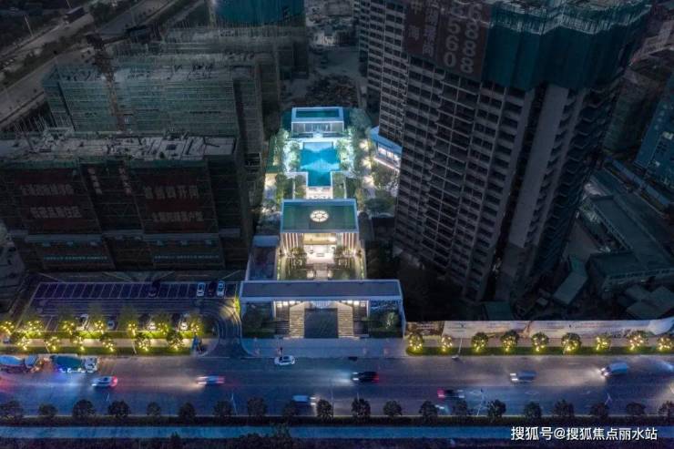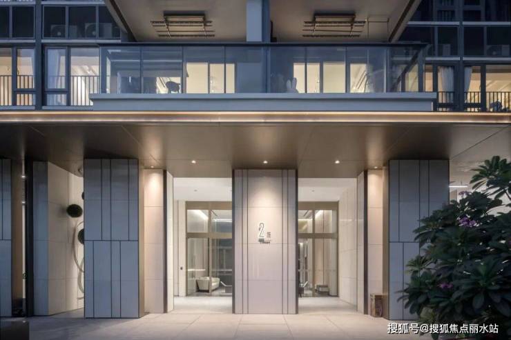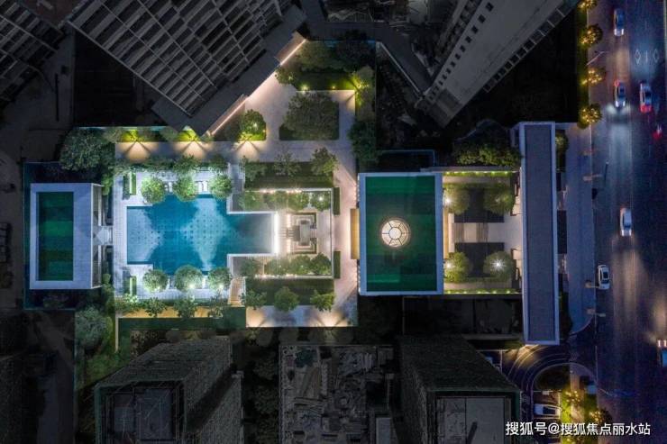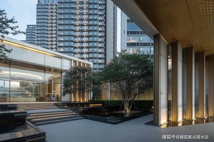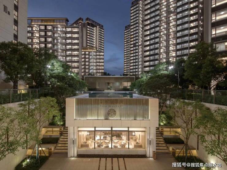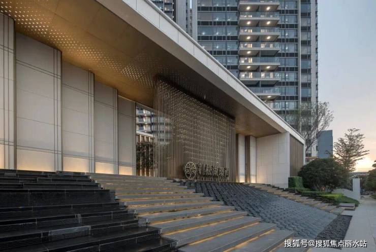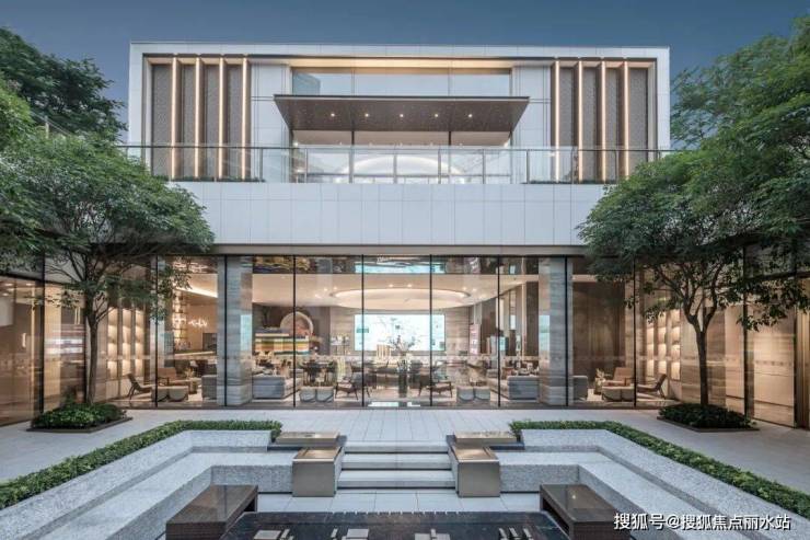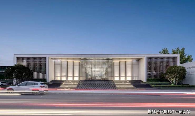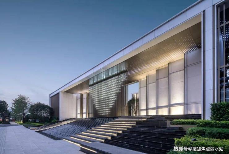 展示区丰富的立面细节结合精致的泛光设计,凸出建筑特性。入口悬挂的水晶装饰,恰似透光的瀑布,与景观水系形成呼应;顶部采用渐变穿孔板,结合内透光的处理手法,打造出黑夜的星空,精细化的设计为人们带来良好的归家体验。