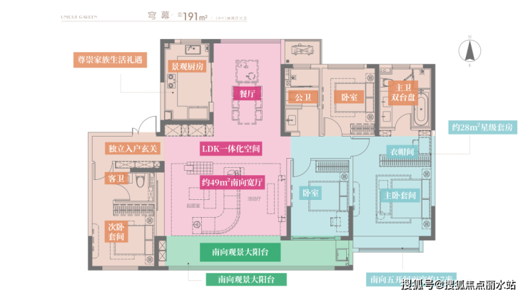 (臻园)建面约191㎡:4室两厅三卫,标准的五开间朝南+双套房设计,南向宽厅,可以打造成客厅+开放式书房、客厅+活动厅。