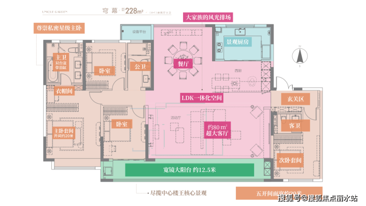 (臻园)建面约228㎡:4+1室两厅三卫,五开间面宽约20米;80㎡的超大客厅+12.5米大阳台:空间相当于刚需房的整套面积,客餐厅相连,阳台可创意成专属健身房;中西双厨房设计+双套房设计:北侧中式厨房,空间充足,U型动线布局,门口空间可打造成开放式西式厨房,各个房间均具隐私性。西侧主卧配有大飘窗、衣帽间、淋浴房和浴缸等配置。