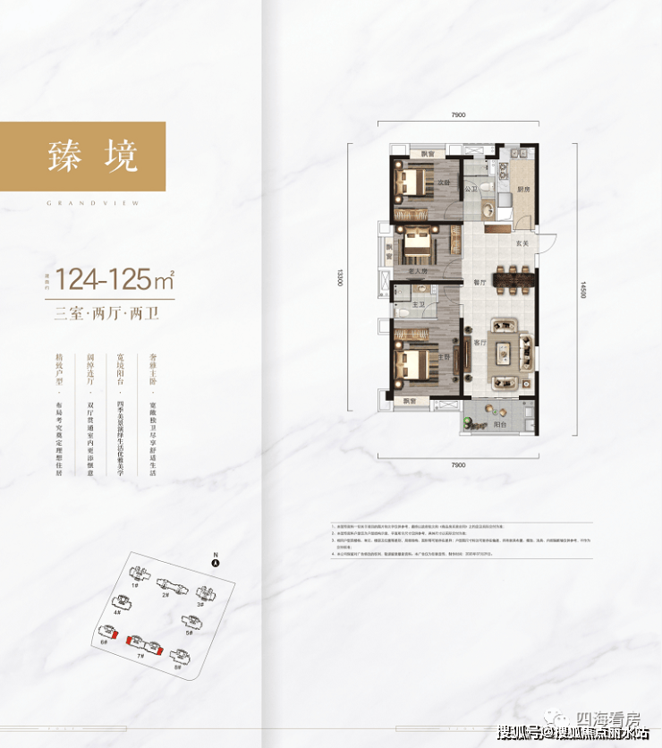 建面约124-125㎡三房两卫:边户设计,这个户型比较不同,进深较长,不过是三面采光,餐客一体,空间大,无浪费空间,带一个南向阳台,可满足日常晾晒功能。售楼处电话400-8787-098接通后输入5678【营销中心】