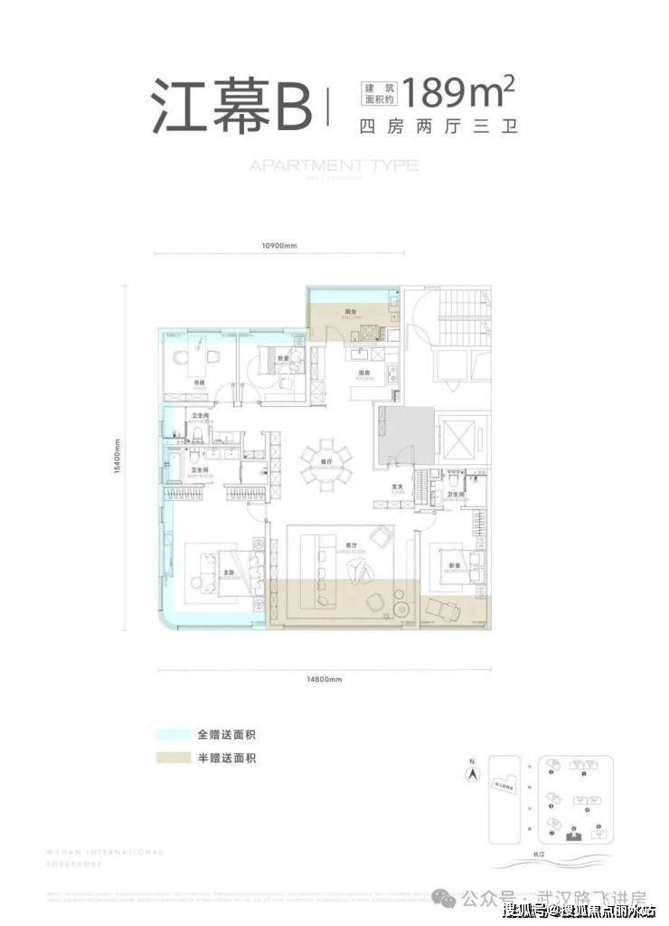 所有楼栋都是两梯两户设计,这意味着每户都有专属电梯前室可供使用;启元计划首推 3、6、7 号楼,其中 6、7 号楼均为头排观江楼栋,位置很有吸引力。三栋住宅的户型面积分别为 141、189、169 平,下面具体看看这三个户型: