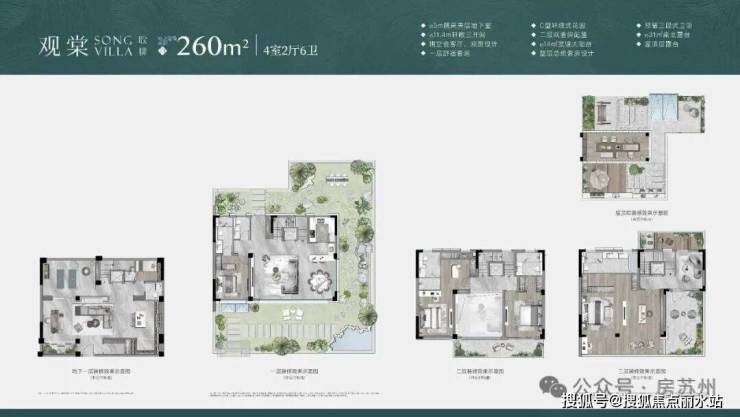 例如约260㎡联排,约11.4米超大面宽;地下室挑高约5米;地上3层,5房6卫,且为全明卫;