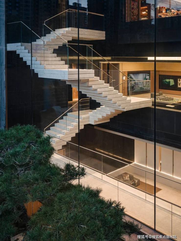 以贯穿三层的自由之梯为例,艺术张力喷薄而出。作为生活艺术馆的交通枢纽,它跳出传统生活艺术馆常见的旋转楼梯设计,矗立于生活艺术馆中央位置,紧靠峡谷水幕景观的同时,在地下一层与一层的衔接处,还创新性地加入了横向廊桥。