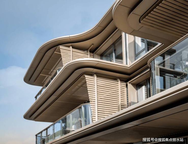 打破了传统立面单调、静止的设计范式,通过多层次的弧形曲面,营造出一种动态生长、与环境及光线共舞的灵动形态。同时,金属铝板、石材与玻璃等材质的精妙搭配,点、线、面的和谐统一,共同塑造出兼具视觉冲击力与触感温度的外立面美学。