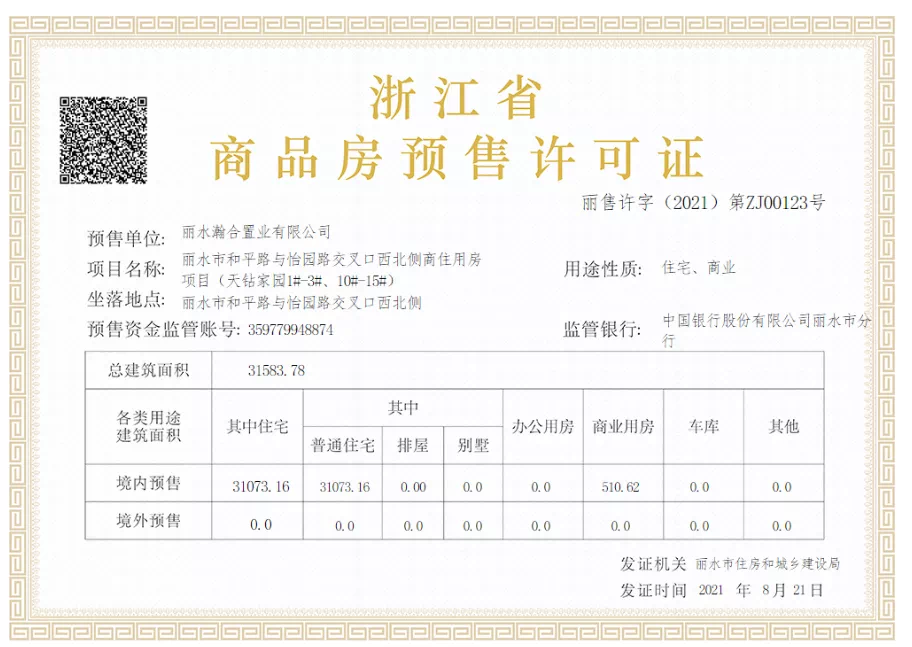 8月21日,丽水市和平路与怡园路交叉口西北侧商住用房项目(天钻)预售证公示。