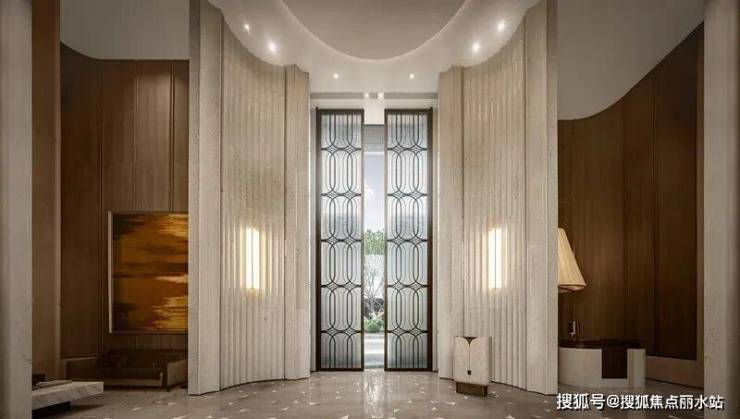 殿堂级门头;入户大堂挑高达到约8.5米,据我所知,市区4、5W+的楼盘高度也才6、7米。
