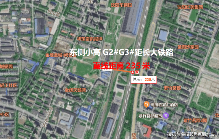 毕竟项目东侧还是有一定的不利因素的,东侧4栋小高,东临沈阳铁路车辆段,距离长大铁路的距离大概只有230米,会有一定的噪音影响。